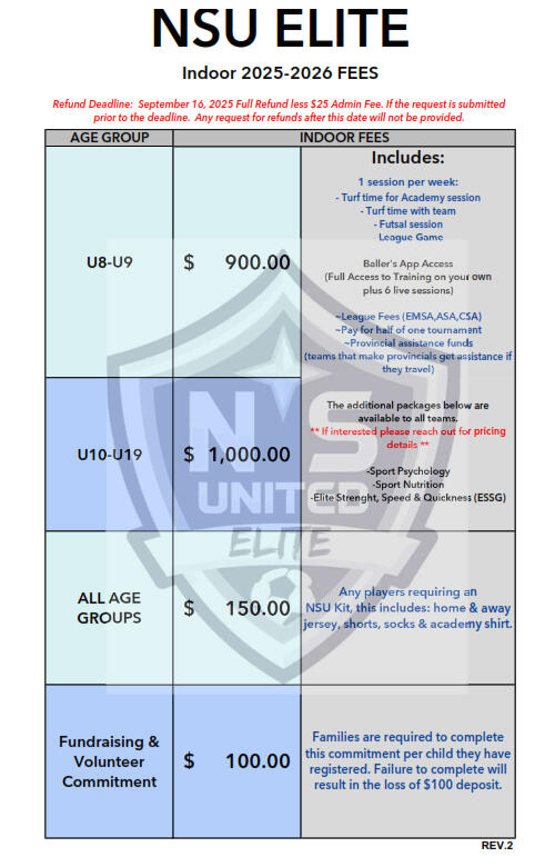 Players with outstanding balances from this outdoor season, must have this cleared up before the indoor season starts.After a player has been selected and offered a spot on a team, the link to register in TeamSnap will be sent out.